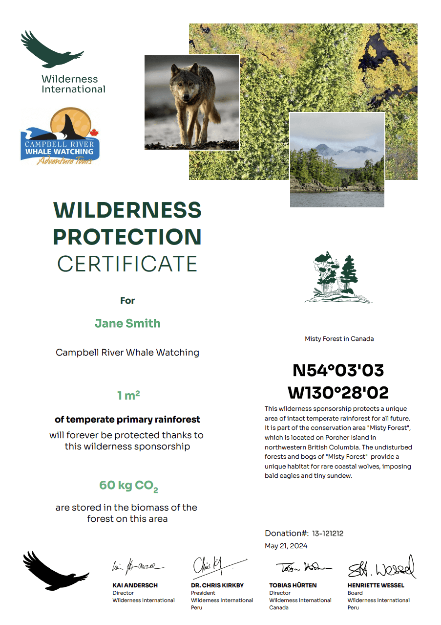 Campbell River Whale Watching hat an Wilderness International vor allem die transparente und konkrete Verwendung der Spenden überzeugt: 1€ Spende schützt 1mUrwald - und zwar für immer. Spender:innen erhalten eine Urkunde mit den Geokoordinaten und einem Luftbild des geschützten Waldstücks, sowie eine steuerlich absetzbare Spendenbescheinigung.