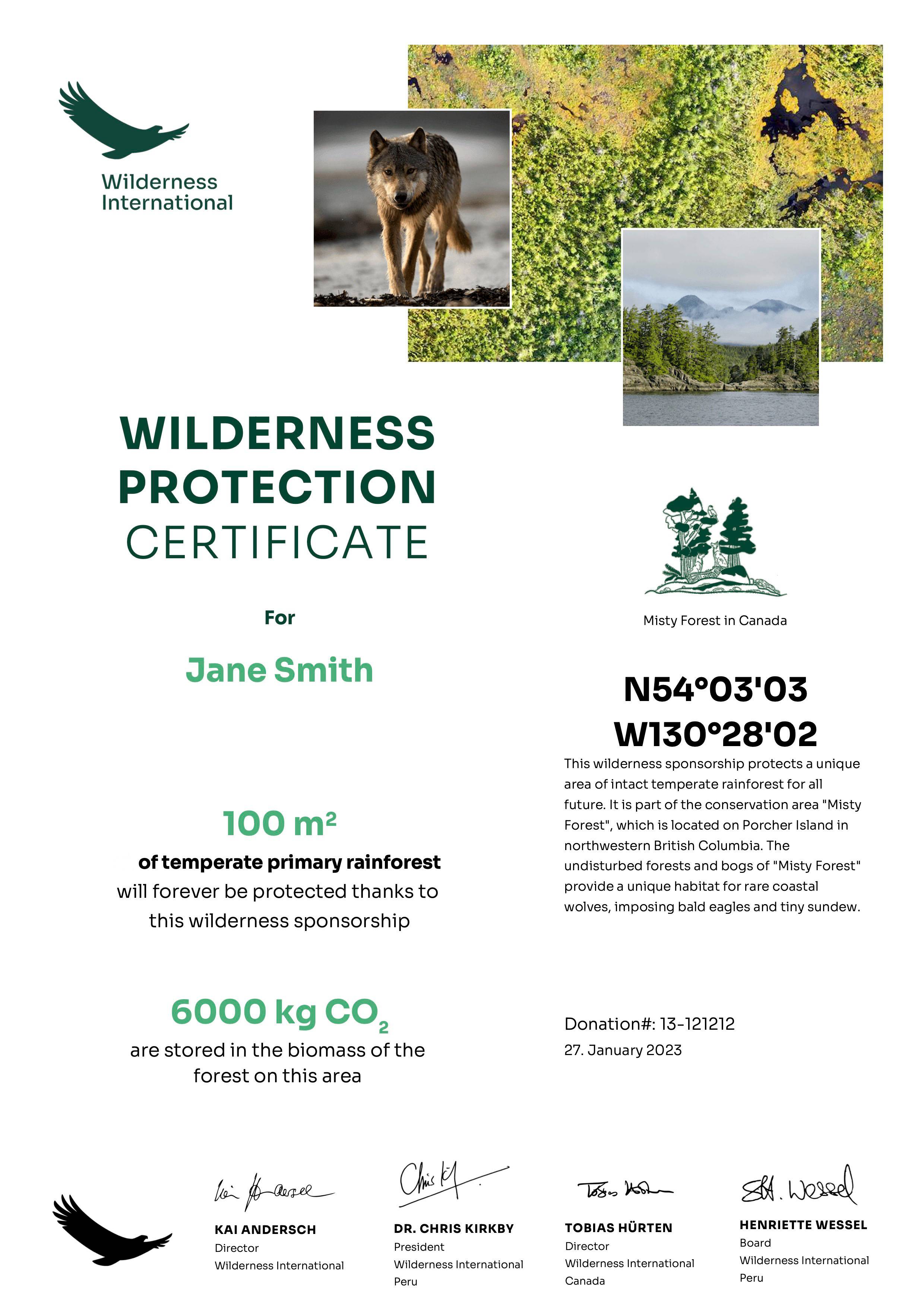 Du erhältst direkt nach deiner Spende eine personalisierte Urkunde über das von dir geschützte Stück Wildnis.