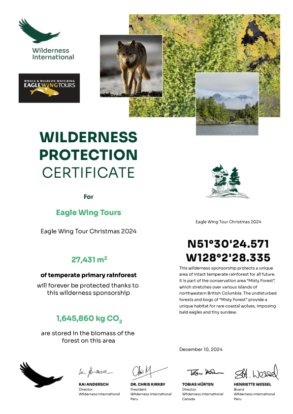 Seit 2019 gleicht Eagle Wing Tours Whale & Wildlife Watching jedes Jahr den verbleibenden CO₂-Ausstoß des Unternehmens zu 100% durch Urwaldschutz aus. Zudem werden durch einen Naturschutz-Dollar ihre Kund:innen mit in den Wildnisschutz einbezogen. Obendrein kommt Wilderness International ein Teil des Gewinns des Unternehmens zugute, der über die Initiative „1% for the Planet“ an die Stiftung und andere Naturschutzorganisationen abgegeben wird.