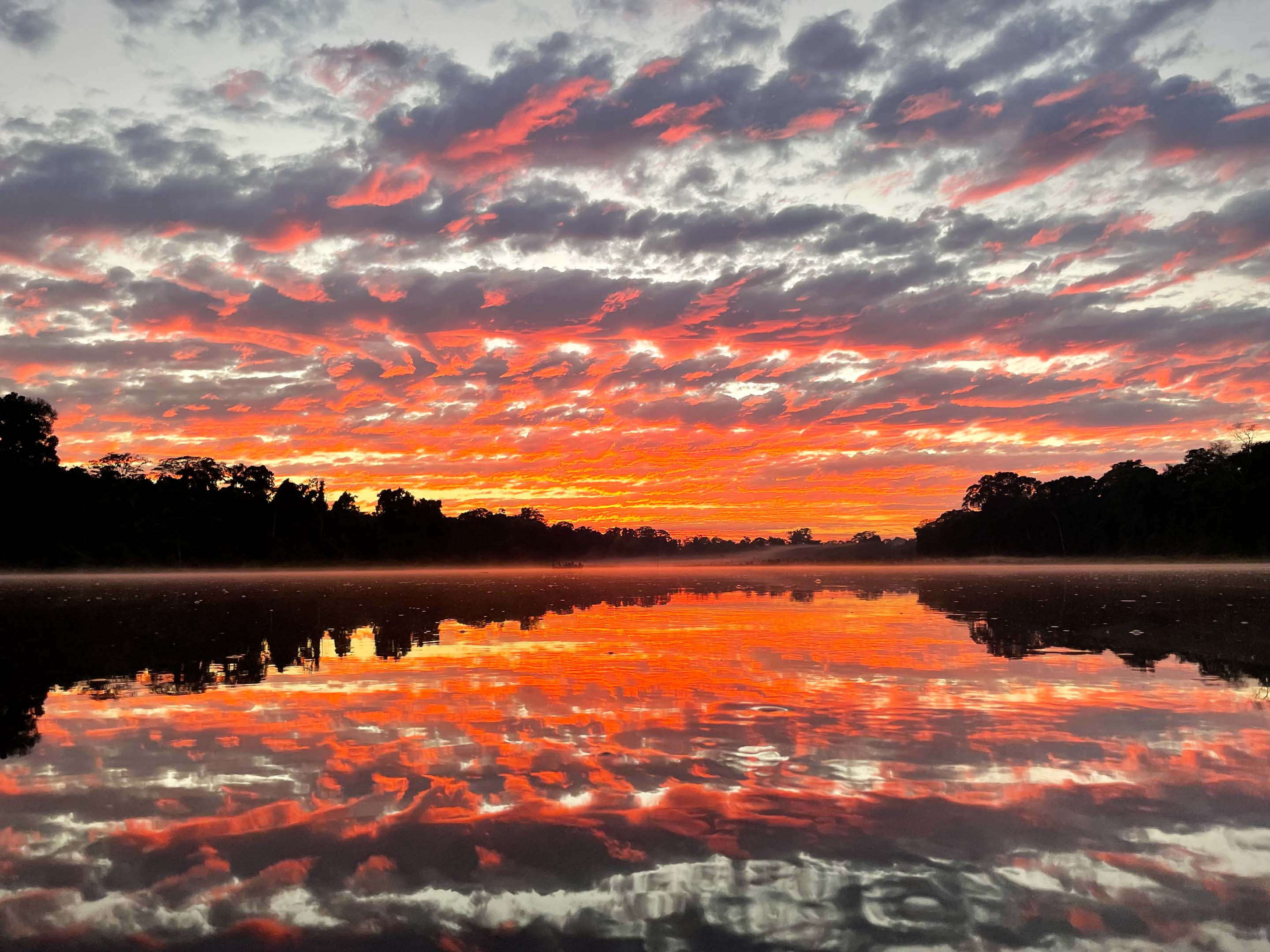 Ein wunderschöner, friedlicher Sonnenaufgang über einem Flussarm des Tambopata, an dem auch der MA Forest liegt.