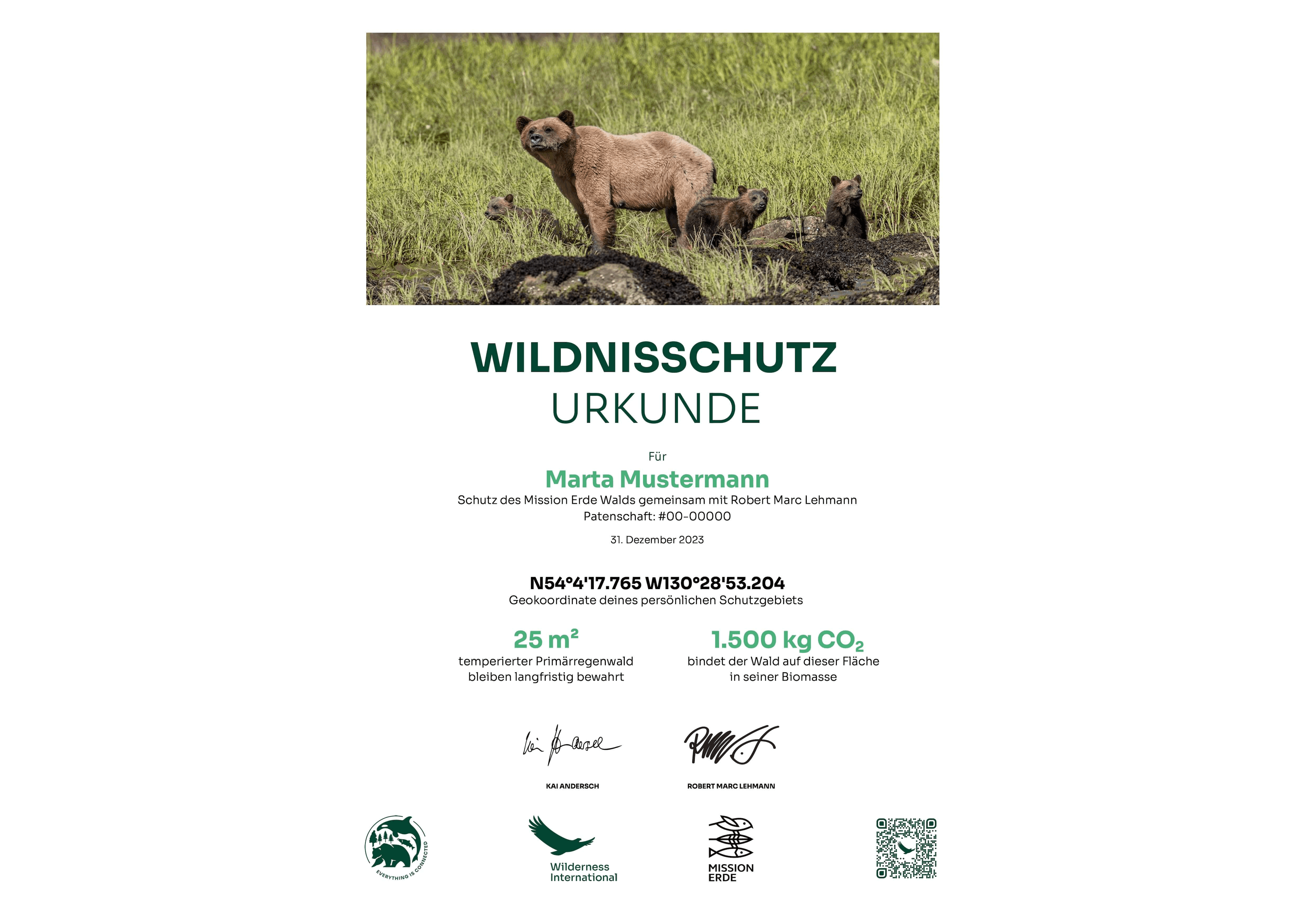 Du erhältst direkt nach deiner Spende eine personalisierte Urkunde über das von dir geschützte Stück Wildnis. Sie eignet sich übrigens auch super als Geschenk!