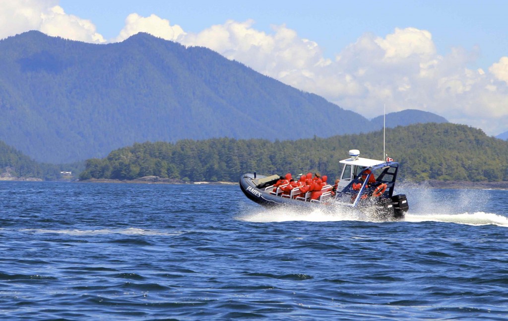 Früh am Morgen fahren wir an der Küste mit den Autos Richtung Norden, ca. 35 km nach Tofino. Bei einem fakultativen Tagesausflug mit einem Zodiac-Schlauchboot gehen wir auf Entdeckungstour. Wir haben großes Glück und sehen auf der Fahrt Schwarzbären, Grauwale, Weißkopfadler und Seelöwen. Sogar die seltenen Seeotter können wir von unserem Boot aus beobachten. Höhepunkt ist eine kleine Wanderung durch den Regenwald zu den heißen Quellen, wo wir in unterschiedlich warmen natürlichen Becken baden gehen. Auf der Rückfahrt nutzen wir am kilometerlangen Strand von Long Beach die Gelegenheit und gehen im Pazifik in den hohen Wellen schwimmen. Der nächste Tag steht zur freien Verfügung. Am Vormittag sitzen die Fußballbegeisterten wieder zum Spiel der Deutschen Nationalmannschaft gegen die USA (1:0) in einem Hotel vor dem Fernseher. Am Nachmittag treffen sich alle vor der Unterkunft und wir wandern gemeinsam ein Stück entlang des sehr romantischen „Wild Pacific Trail“ von Ucluelet zum alten Leuchtturm und zurück. Hier lohnt sich jeder Meter! Die Ausblicke sind atemberaubend und man bekommt einen grandiosen Einblick in die Natur, das Klima und die Vegetation der Halbinsel von Ucluelet. Wir genießen besonders den tollen Blick auf den rauen Pazifik mit den vorgelagerten Felsen und kleinen Inseln. Es ist wahrhaftig einer der schönsten Wanderwege an der Westküste von Vancouver Island. Bei einem zünftigen Grillabend wollten wir eigentlich die tolle Zeit an diesem Ort abschließen, aber es beginnt stark zu regnen. Unter einen kleinen Vordach können wir außerhalb grillen und die Fete findet in einem Zimmer statt.
