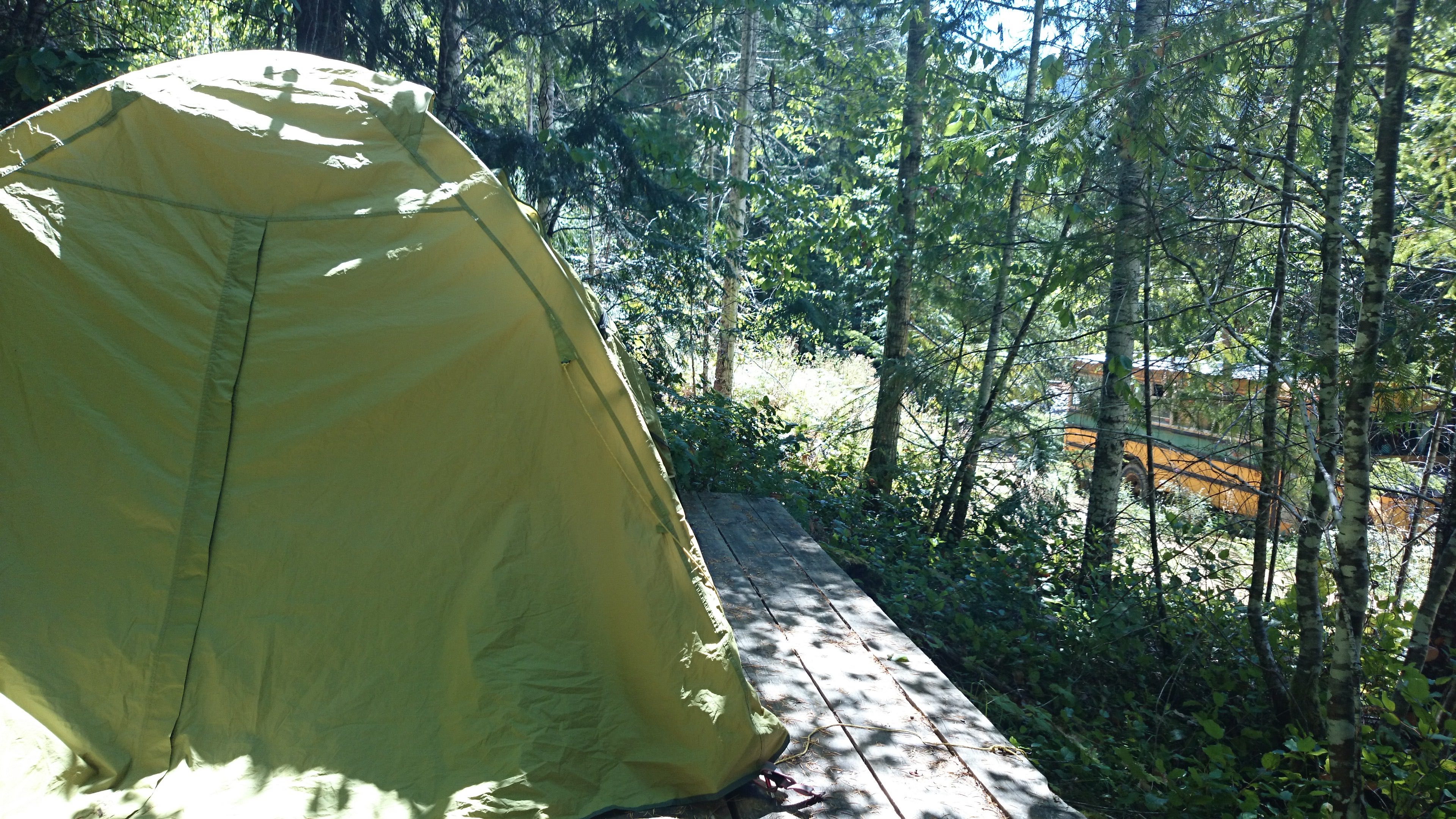 Mein Schlafplatz befindet sich oberhalb der Gästehäuser der Lodge auf der Tent Platform in der Umgebung einiger kleiner Häuser der Guides und der Barn (der Scheune), in der manchmal Veranstaltungen stattfinden, gerade laufen Vorbereitungen für eine Hochzeit. Man könnte denken mein direkter Nachbar sei Christopher McCandless, über den Jon Krakauer das Buch „Into the Wild“ geschrieben hat. Christopher McCandless machte sich 1990 allein nach Alaska auf und fand dort in der Wildnis einen verlassenen amerikanischen Schulbus, in dem er sich für kurze Zeit einrichtete – der alte amerikanische Schulbus schräg gegenüber meinem Zelt erinnert mich sofort an diese Geschichte. Er scheint zwar nicht bewohnt zu sein, aber ist vollgestopft mit Ausrüstung und sieht, bis auf die Farbe, genauso aus wie Christophers Bus. Die Tent Platform wird mein persönlicher Lieblingsort, denn bis auf das Rauschen der Blätter im Wind und die Vögel ist alles still. Wenn man Glück hat, kann man sogar Waldtiere beobachten: ich sehe viele Vögel, Eichhörnchen und auch ein kleines Wiesel.