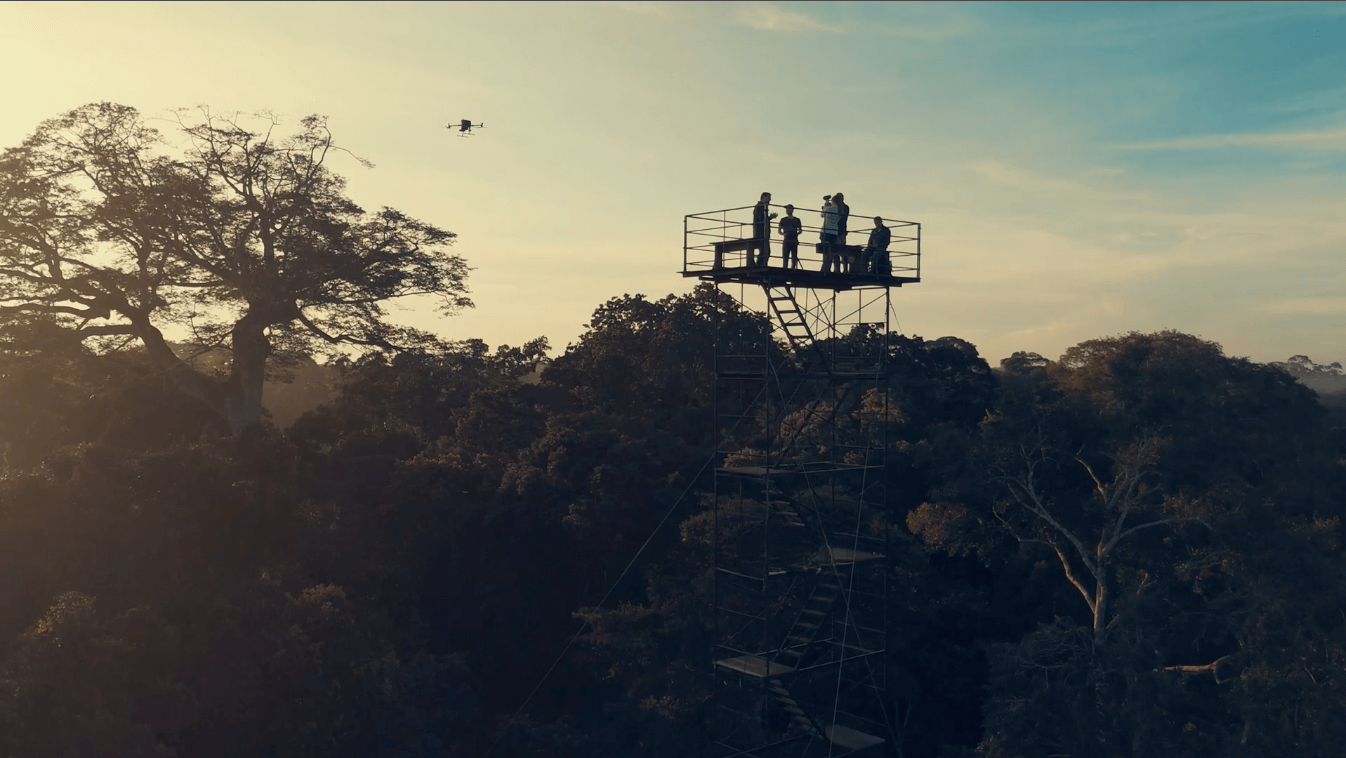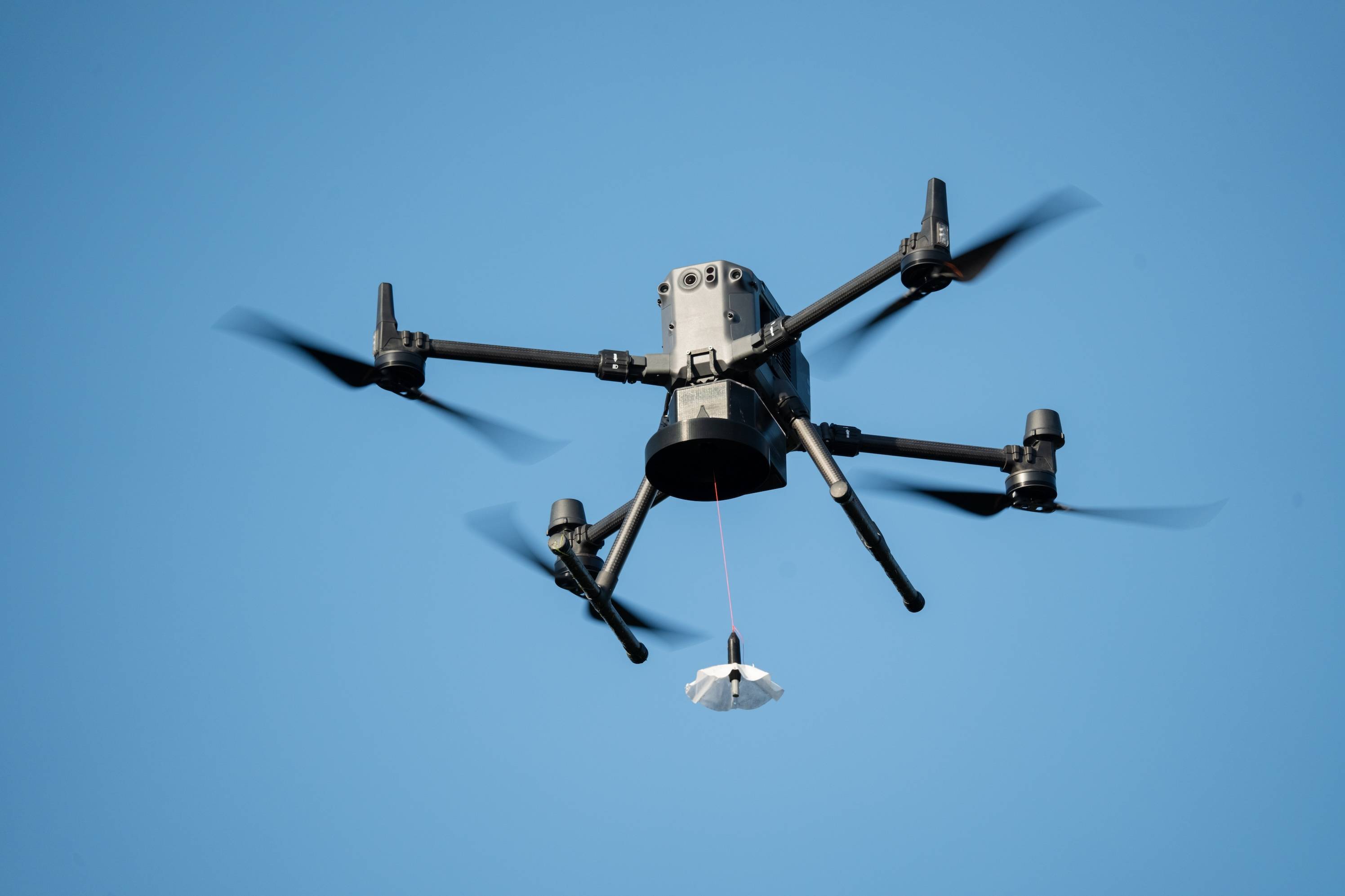 Die DJI Matrice Drohne mit dem Roboter der ETH Zürich auf dem Weg in die Baumkronen, um eDNA Proben zu entnehmen.
