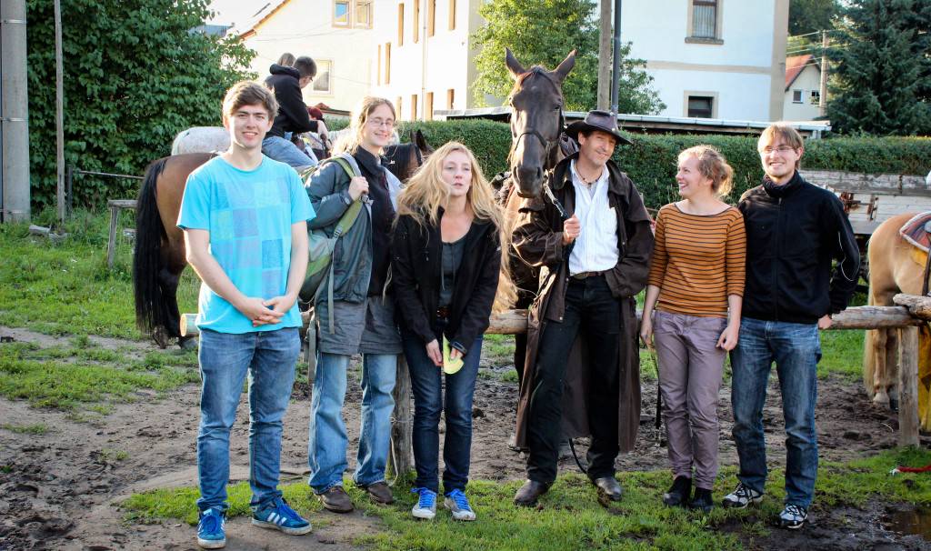 Nach der getanen Arbeit machte sich das Wilderness International Büro-Team auf zum kleinen Teambuildingritt nach Liegau-Augustusbad. Auch wenn sich die Anfahrt ein wenig schwierig gestaltete, da Keith’s Navi keinerlei Ortskenntnis vorweisen konnte, wurde nach Ankunft sofort im Regen aufgesattelt. Von Pferdevater Tino gab es noch eine 5-minütige Einführung und dann musste jeder mit seinem Pferd glücklich werden.