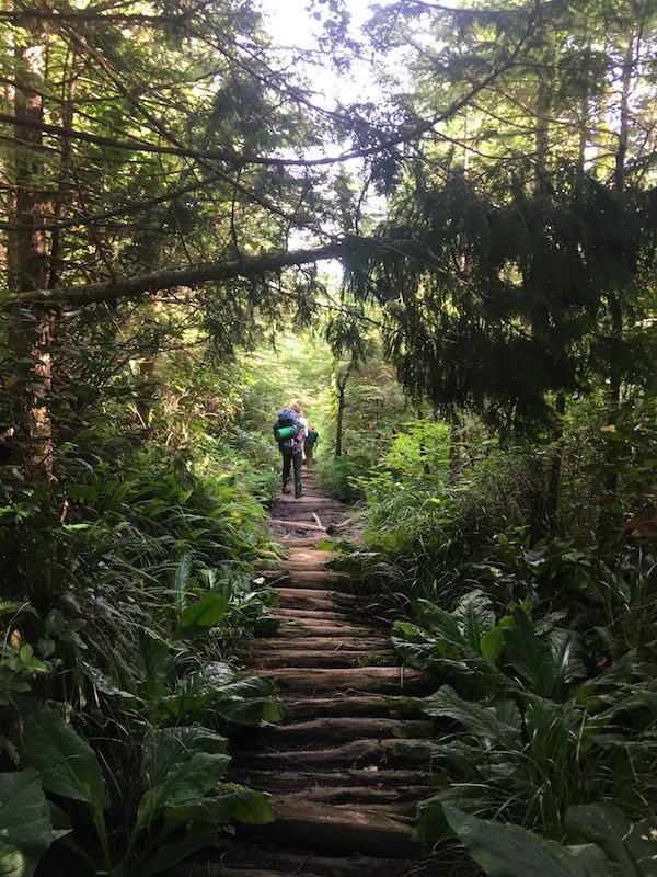 Der Himmel ist scheinbar genauso betrübt wie wir, dass David und Fabian nun nicht mehr dabei waren, denn es regnet auch noch die nächsten Stunden. Der Sturm hat sich aber glücklicherweise gelegt. Wegen der allgegenwärtigen Nässe und dem feinen Sand müssen wir allerdings notgedrungen unser gesamtes Equipment feucht und dreckig einpacken. Mein größter Wunsch in diesem Moment ist, dass irgendwann innerhalb der nächsten 48 Stunden die Sonne scheint, damit wir alles säubern und trocknen können. Doch jetzt geht es erst einmal offiziell mit dem North Coast Trail los für uns. 15 km liegen heute vor uns, die wir dank der letzten Tage ja allerdings schon bestens kennen. Das Gepäck drückt zwar immer noch schwer auf den Rücken, ist dank einiger Umpackaktionen und gelernter Lektionen aber insgesamt doch etwas leichter. Also heißt es ab jetzt für die nächsten Tage: Schritt an Schritt. Der Weg ist das Ziel. Über rutschige Planken schlitternd, an riesigen Pfützen über Wurzeln balancierend und durch Matsch stapfend geht es voran. Zur Mittagspause nieselt es immer noch, wir sind unter unseren Regensachen komplett verschwitzt und daher sowohl von außen als auch von innen nass. Glücklicherweise sind wir mittlerweile gut eingelaufen und die Stimmung im Team ist ungetrübt. Der alte Wald mit den dicken Stämmen der Riesenlebensbäume und Sitkafichten, die unzähligen Schattierungen von Grün und die Spuren der Bären und Wölfe sind einfach zu verzaubernd, als dass man nicht staunend, lauschend und beobachtend durch den Wald laufen könnte, Regen und Gepäck hin oder her. Außerdem wissen wir, dass sich der Weg allemal lohnt, denn unser Ziel ist wieder die Nissen Bight, ein wunderschöner Halbmond aus weißem Sandstrand.