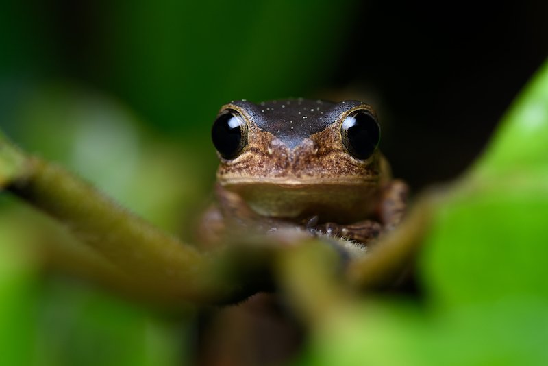 Er erklärt mir, dass er mit seiner Stirnlampe durch den Wald leuchtet und nach winzigen Reflexionen Ausschau hält. Diese Reflexionen kommen von den Augen der Tiere und Insekten. Sobald er eine Reflexion entdeckt hat, fängt er das Lebewesen und untersucht es zu wissenschaftlichen Zwecken. Nach der Untersuchung wird es wieder freigelassen.