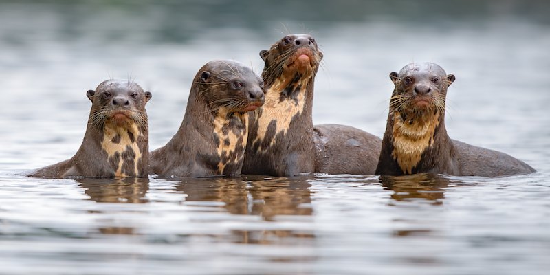 Es geht runter zum Fluss und zu einer Lehmlecke nur ein paar hundert Meter flussabwärts. Kurz nach Sonnenaufgang finden sich hier verschiedenste Papageien ein, um Lehm zu fressen, eines der spektakulärsten Farbenspiele im Dschungel. Ein guter Start in den Tag, aber eben nur der Anfang! Nach den Papageien wandern wir für eine knappe Stunde durch den Wald, bis wir zu einem der Altarme des Tambopata Flusses kommen. Diese Waldseen bilden sich nur dort, wo ein Fluss sich noch ungehindert durch die Landschaft winden kann. Sie sind ein besonderes Habitat und das zu Hause einer der charismatischsten Arten Amazoniens: der Riesenotter. Diese bis zu 180 cm großen Otter leben in Familiengruppen, wobei eine Familie einen ganzen See für sich beansprucht. Versteckt am Ufer wartet ein Kanu, mit dem wir uns auf Schleichfahrt begeben. Man darf sich nichts vormachen, an die Otter können wir uns nicht anschleichen, sie sehen uns noch bevor wir sie entdeckt haben. Ihr lautes Schnaufen und Käckern, das uns als Warnung dienen soll, zeigt uns erst an wo sich die Tiere befinden. Jetzt ist Geduld und Glück gefragt – wollten die Tiere ihre Ruhe, hätten wir keine Chance sie zu verfolgen. Glücklicherweise sind wir selbst eine Attraktion, und als Gruppe trauen sich die Tiere an uns heran um uns genauer zu beäugen. Für eine Weile beobachten sich beide Fraktionen gespannt, dann scheinen wir langweilig geworden zu sein und die Otter beginnen mit ihrer täglichen Fischjagd.