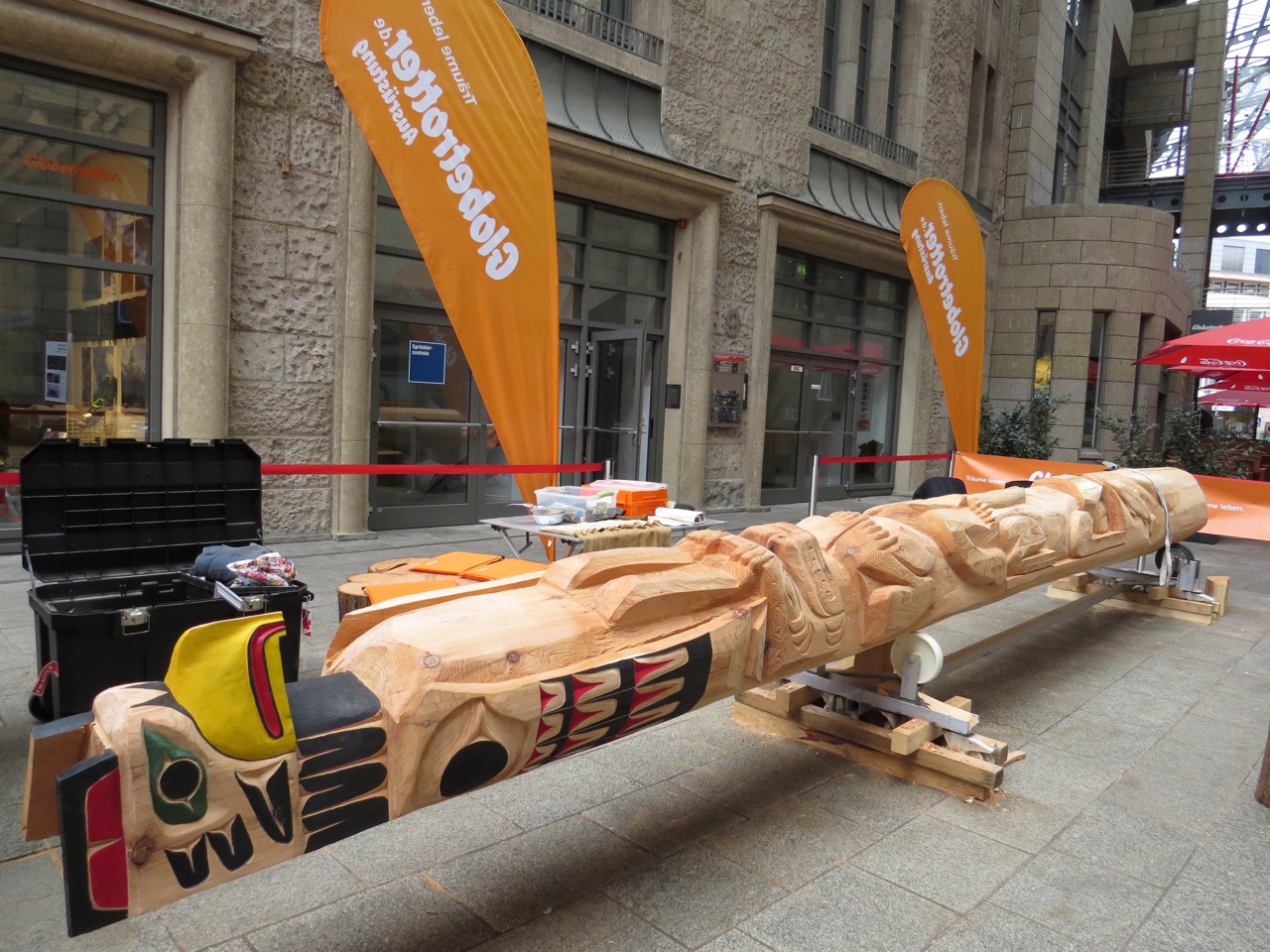 Die Arbeit vor Ort zeigt, daß der Totempfahl zum Projekt der Begegnungen wird. Ein Austausch von Kulturen, Kultur und Menschlichkeit. Wir freuen uns auf die noch verbleibenden Wochen bis zur feierlichen Eröffnung am 5.10. und sind auf weitere wunderbare Begegnungen am Pfahl gespannt!
