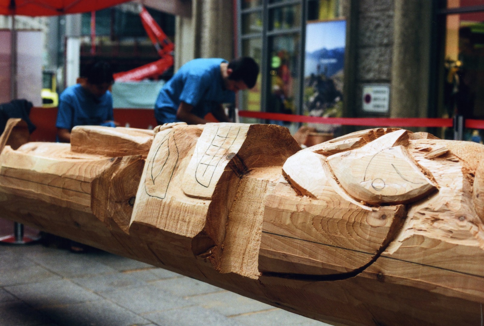 Mittlerweile nehmen die weiteren Tiere des Totempfahls Gestalt an. Unterhalb des Donnervogels befindet sich eine Schwarzbärin. Es ist eine Schwarzbärin da im Stammesgebiet der Cowichan Indianer weder Braunbär noch Grizzly sondern ausschließlich Schwarzbären vorkommen. Die Bärin hat sich gerade einen Lachs gefangen und hält ihn in ihren Pfoten. Seit auf dem Kopf Auge und Maul vorgezeichnet sind, fällt es auch den Passanten leichter die Bärin als solche zu erkennen. Vorher war dies nicht so deutlich, da der Donnervogel direkt auf dem Bärenkopf steht und die runden Ohren neben den Klauen des Greifvogels geschnitzt werden.