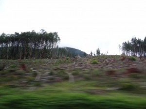 Gestern sind wir längs durch Vancouver Island gefahren, eine Insel etwa so groß wie Sachsen und Thüringen zusammen. Überall steht Wald, es gibt kaum Städte oder Dörfer. Der Wald sieht, wenn man nicht so genau hinschaut, aus wie in unseren deutschen Mittelgebirgen, nur mit dem Unterschied, dass zwischendurch immer wieder riesige Flächen frisch gerodet oder mit sehr jungen Bäumen bewachsen sind. Der Flickenteppich zieht sich über Berge und Täler, gegliedert durch ein engmaschiges Netz von Forststraßen. Auf den Straßen sieht man immer wieder große Langholzlaster, voll beladen in die eine Richtung, leer in die andere. Ein Land lebt vom Wald.