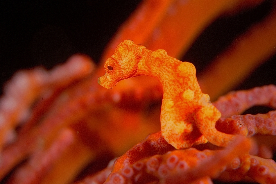 Die Bucht von Tulamben war diesbezüglich bei meinem letzten Besuch ein Eldorado. Und sie ist es immer noch. Interessant ist, dass es nicht immer die gleichen Spezies sind, die es hier zu finden gibt, sondern sich nach meinem Empfinden ihre Zusammensetzung immer wieder ändert. Was ich bei all meinen Besuchen in Tulamben antraf waren Zwerg-Seepferchen (Hippocampus bargibanti). Zugegeben, sie sind nicht einfach zu finden, denn die kaum fingernagelgroßen (und ich habe meine Fingernägel frisch geschnitten) Tiere sind perfekt an ihre Wirtkoralle angepasst.