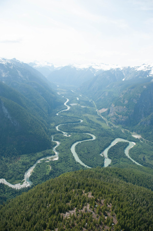 Während ich mich in meinem Pulli versteckte, umgaben sie sich mit einem weiten Mantel aus Nebel. Das Zwitschern einiger Vögel drang an mein Ohr, als mein Blick dem Lauf des von Nebel umhüllten Toba River nach oben folgte.