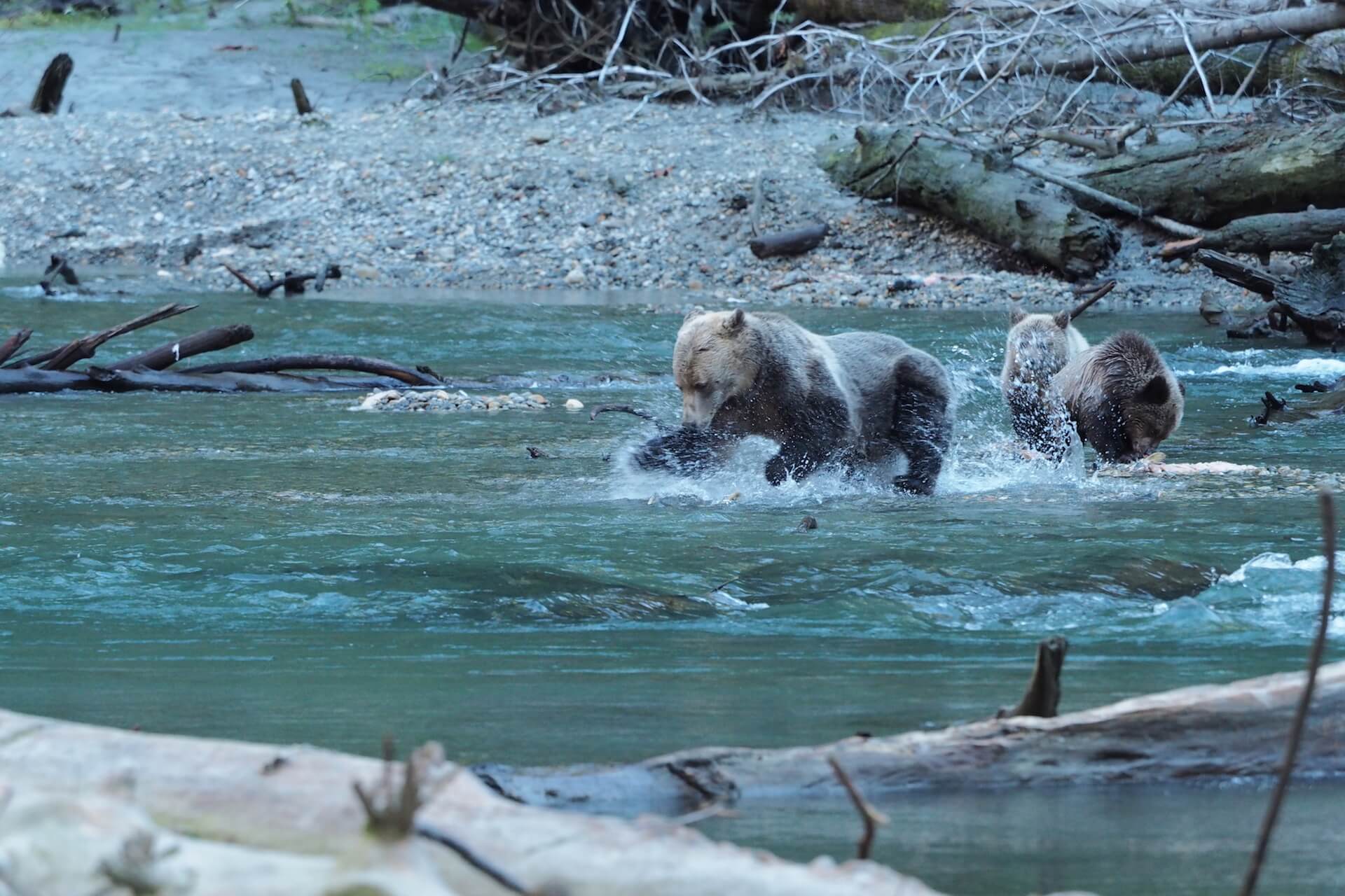 Mittlerweile hat die Grizzlymutter einen Lachs gefangen, der noch kurz in ihrem Maul zappelt, bis sie ihn letztendlich tot beißt. Sie nimmt den Lachs und schleppt ihn auf einen Holzstamm, die kleinen Bärenkinder laufen hinterher und zu dritt wird der Lachs verspeist. Immer wieder schnuppert die Bärenmutter und hält nach uns Ausschau, doch sie hat uns akzeptiert, das spüren wir. Sie nimmt uns auf in ihr Gebiet und duldet uns. Uns, als Menschen, die nicht dorthin gehören. Uns, als Menschen, die die Natur Tag für Tag zerstören, nur damit wir noch mehr Autos, Schiffe, Häuser haben können, die schneller, größer und besser sind. Doch diese Bären kennen keine Menschen, denn das Toba Valley und die Schutzgebiete von Wilderness International sind unberührt. Sie haben gemerkt, dass wir als Menschen dort für sie keine Gefahr darstellen und lassen uns deswegen in unserem Raum Platz.