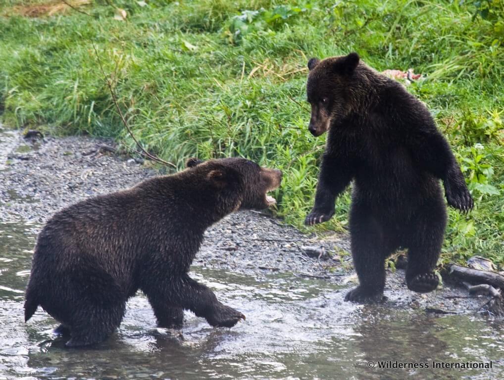 Als wir vorbei treiben, beobachtet er das erste Raft skeptisch, dreht sich kurz um, bevor er auf uns losläuft! Scheinangriff! Wenige Meter vor uns dreht er ab und läuft zurück zum Ufer. Auch die anderen beiden Rafts lässt der 2-jährige Bär nicht aus den Augen und kommt immer wieder auf eine beachtliche Distanz heran.