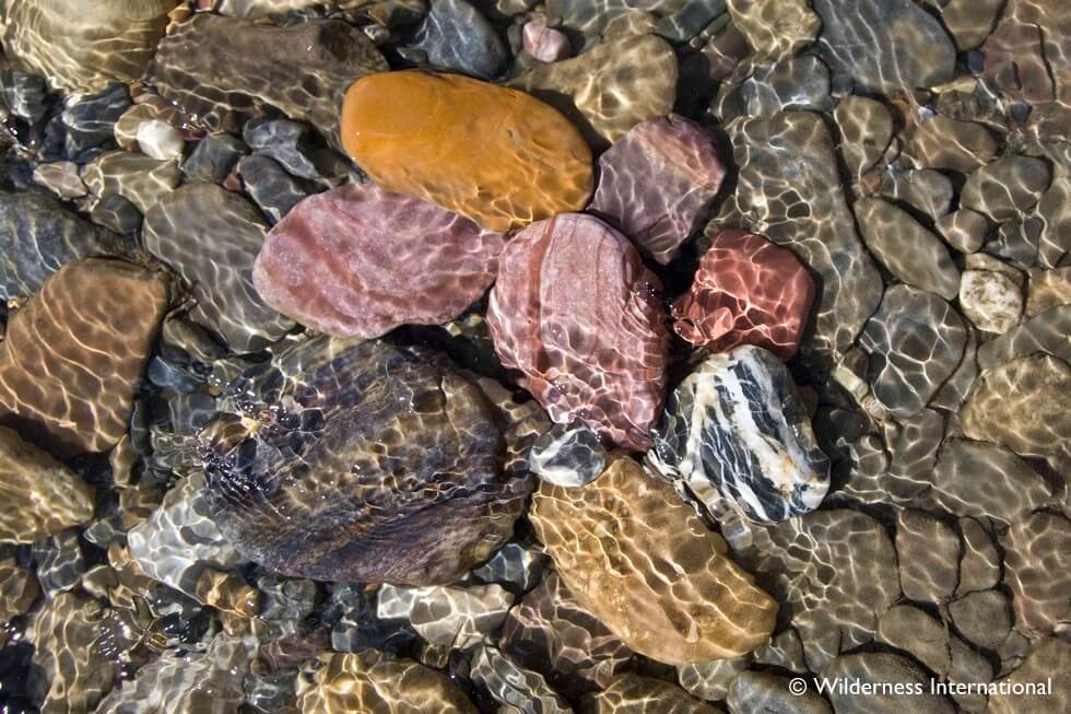 Daniel, der zusammen mit Ältesten und Jugendlichen aus seinem Volk und Wilderness International vor 10 Jahren schon einmal die Expedition mitgemacht hat, zeigt uns die bunten Steine im Reptile Creek. Fast jeder Stein zeugt von Mineralieneinschlüssen, bestehend aus Eisenerz, Kupfereinschlüssen, Silber und Kohle. Und die Berge in östlicher Richtung werden von mineralischen Farbbändern durchzogen. Sie sind der Namensgeber dieser einzigartigen Bergwildnis: Land of the painted Mountains.