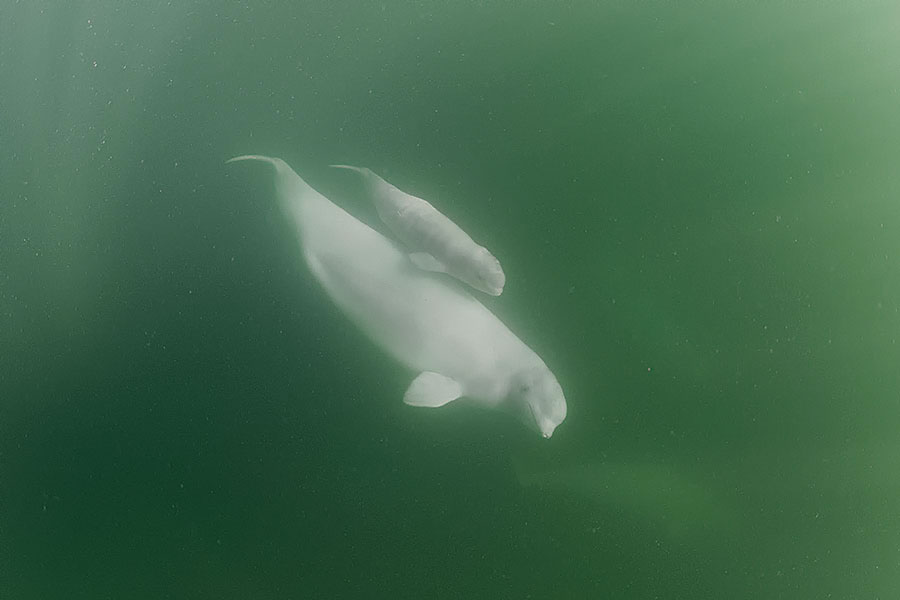 Erfreulich ist, dass wir so viele junge Tiere gesehen haben. Die jungen Belugas sind im Gegensatz zu den adulten Tieren noch blaugrau bis braun gefärbt. Bis zu zwei Jahren bleibt das Kleine bei der Mutter und bekommt auch erst im zweiten Lebensjahr seinen Zahndurchbruch.