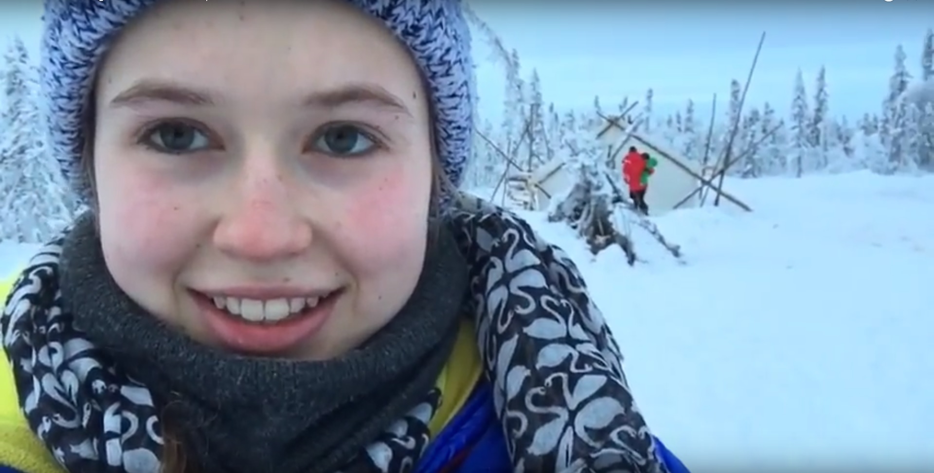 Vor einer Weile waren wir den ganzen Schultag lang im Camp! Es war einer meiner besten Tage hier bist jetzt – draußen sein, direkt das Camp-Leben kennenlernen und die Kinder im tiefen Schnee spielen sehen. Ich bewundere sie – habe versucht, fünf Minuten im Schnee zu rennen und war völlig erschöpft! Die ganze Zeit über wären wir von Märchenwald umgeben, hüfttief mit Schnee bedeckt. Und wem es kalt wird (soll ja vorkommen bei -20°C!), der kann sich im Zelt oder einem der kleinen Häuschen am Holzofen aufwärmen und frisch gebackenes Brot und heißen Tee genießen. Das Zelt ist faszinierend – der Boden ist mit einer dicken Schicht Fichtenzweige bedeckt, so dass es warm und weich ist und wunderbar riecht, besser als in der Badewanne! Zum Mittagessen haben wir uns alle darin versammelt und Karibusuppe geschlemmt. An Camp-Tagen wie diesen können die Kinder viel Zeit mit den Ältesten verbringen, hören Geschichten von Ihnen und lernen, wie das Leben im Camp war, als die Gwich’in noch das ganze Jahr über in der Wildnis gelebt haben. Wie gehen wir respektvoll mit unserer natürlichen Heimat um, nehmen und geben zurück, lassen keine Spur zurück. Shayla und ich sind auch sehr dankbar, dass wir unsere Projektideen mitteilen durften! Und sie hatten so viele Fragen, herrlich diese Neugier!