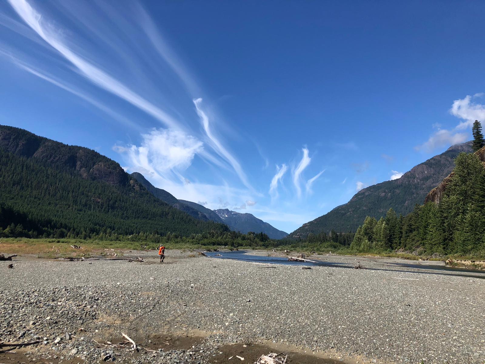 Leider ist für uns schon der letzte Tag in der Wildnis am Elk River herangenaht. Am frühen Morgen, von der Sonne begrüßt, waschen wir uns im Fluss und bereiten unser Frühstück auf dem Lagerfeuer zu. Es gibt Pancakes und Ei mit Kartoffeln und Speck – köstlich. Anschließend beginnen wir die Zelte zusammenzupacken und aufzuräumen. Nur kurz darauf sind wir schon wieder am Kanu angekommen und paddeln den Fluss entlang, zurück in den See Richtung Strathcona Park Lodge. Bei recht starkem Gegenwind sind wir nicht so schnell wie auf der Hinfahrt, aber dafür ist das Wetter deutlich sonniger. Wir legen sogar einen kurzen Zwischenstopp zum Baden ein. Letztendlich sind wir jedoch viel zu schnell wieder in der Zivilisation zurück. Aber wir sind unendlich dankbar, diese Erfahrung in der Wildnis gemacht haben zu dürfen.