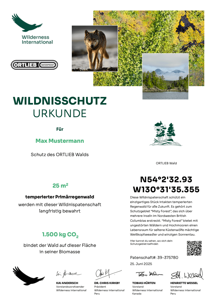 ORTLIEB arbeitet seit 2022 mit der Stiftung Wilderness International gemeinsam an der Mission, die letzten intakten Urwälder unserer Erde zu schützen. ORTLIEB stellt nicht nur wertvolles Eqiupment für unsere Expeditionen bereit, sondern schützt dem ORTLIEB Firmenwald in Westkanada ganz direkt wertvollen Regenwald - und mit ihm den Lebensraum für eine riesige Artenvielfalt und die Grundlage für ein gesundes Klima.