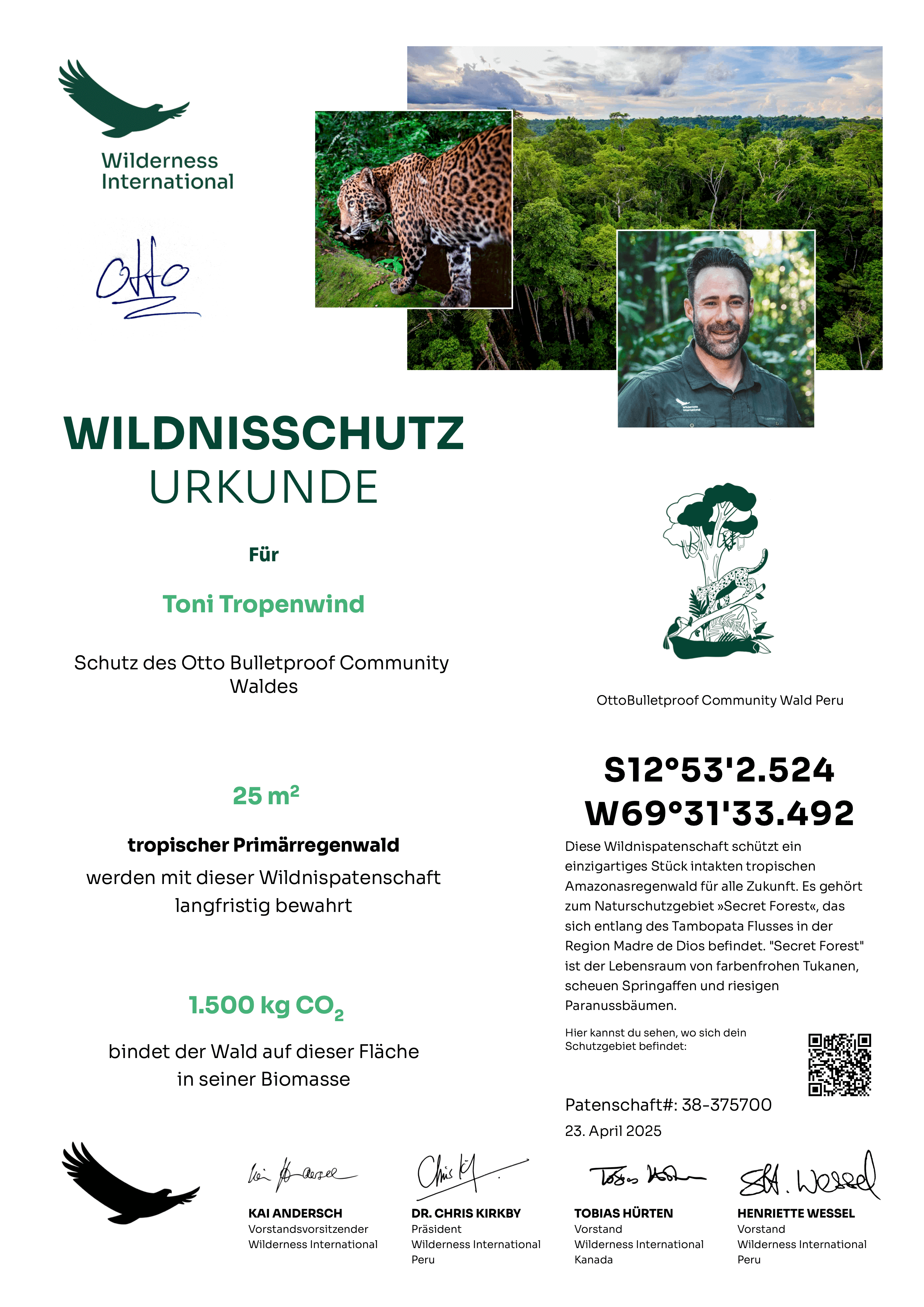 Du erhältst direkt nach deiner Spende eine personalisierte Urkunde über das von dir geschützte Stück Wildnis. Sie eignet sich übrigens auch super als Geschenk!