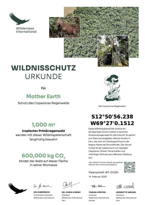Du erhältst direkt nach deiner Spende eine personalisierte Urkunde über das von dir geschützte Stück Wildnis.