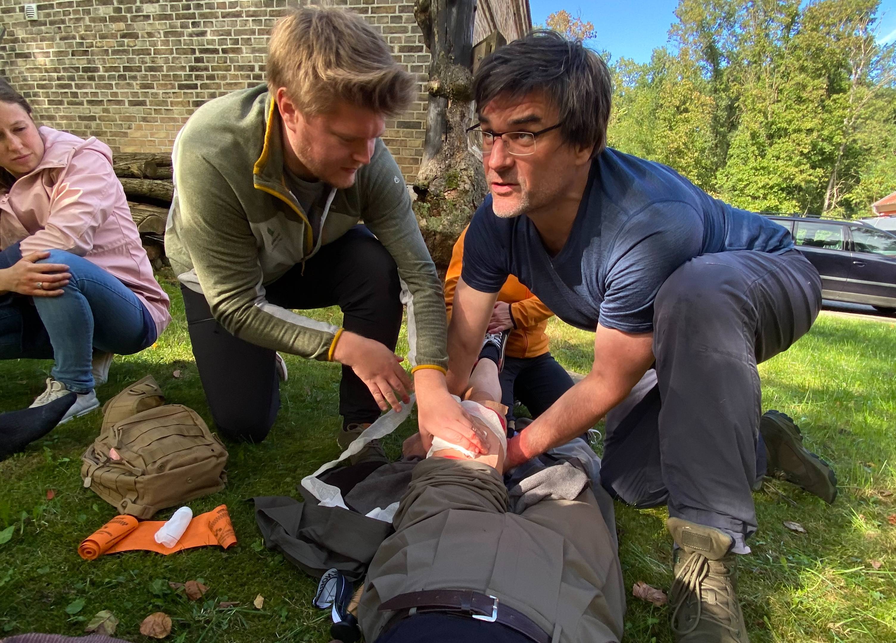 Seit 2023 bereitet uns Clemens auf Notfallsituationen während unserer Expeditionen vor. Dabei lernen unsere Teammitglieder wie man Notfallpläne und sinnvolle erste Hilfe-Sets für unsere Outdoor-Situation zusammenstellt. Außerdem wird trainiert, wie Gelenkverletzungen, Hypothermie, Tierbisse, Schnittwunden oder Verbrennungen behandelt werden können. Auch die Teamzusammenarbeit muss für Extremsituationen eingeübt werden.