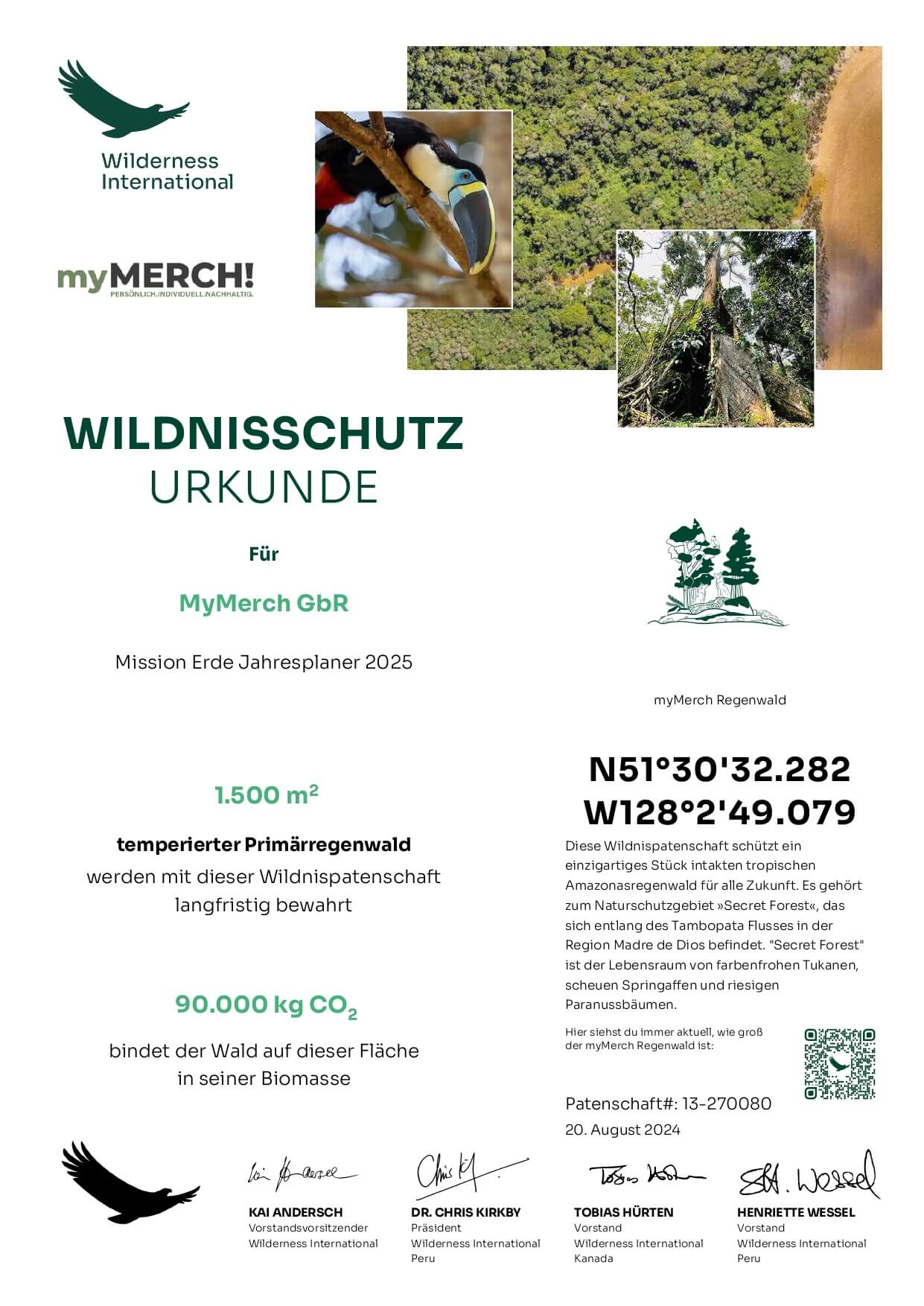 Mit jedem Kauf von Robert Marc Lehmanns Jahresplaner schützen Robert und myMerch einen Quadratmeter Urwald für immer. Der Jahresplaner enthält einen QR-Code, mit dem du dir das von dir und vielen anderen geschützte Waldstück direkt einsehen kannst. Die Urkunde der Spende von myMerch kannst du dir hier ansehen.