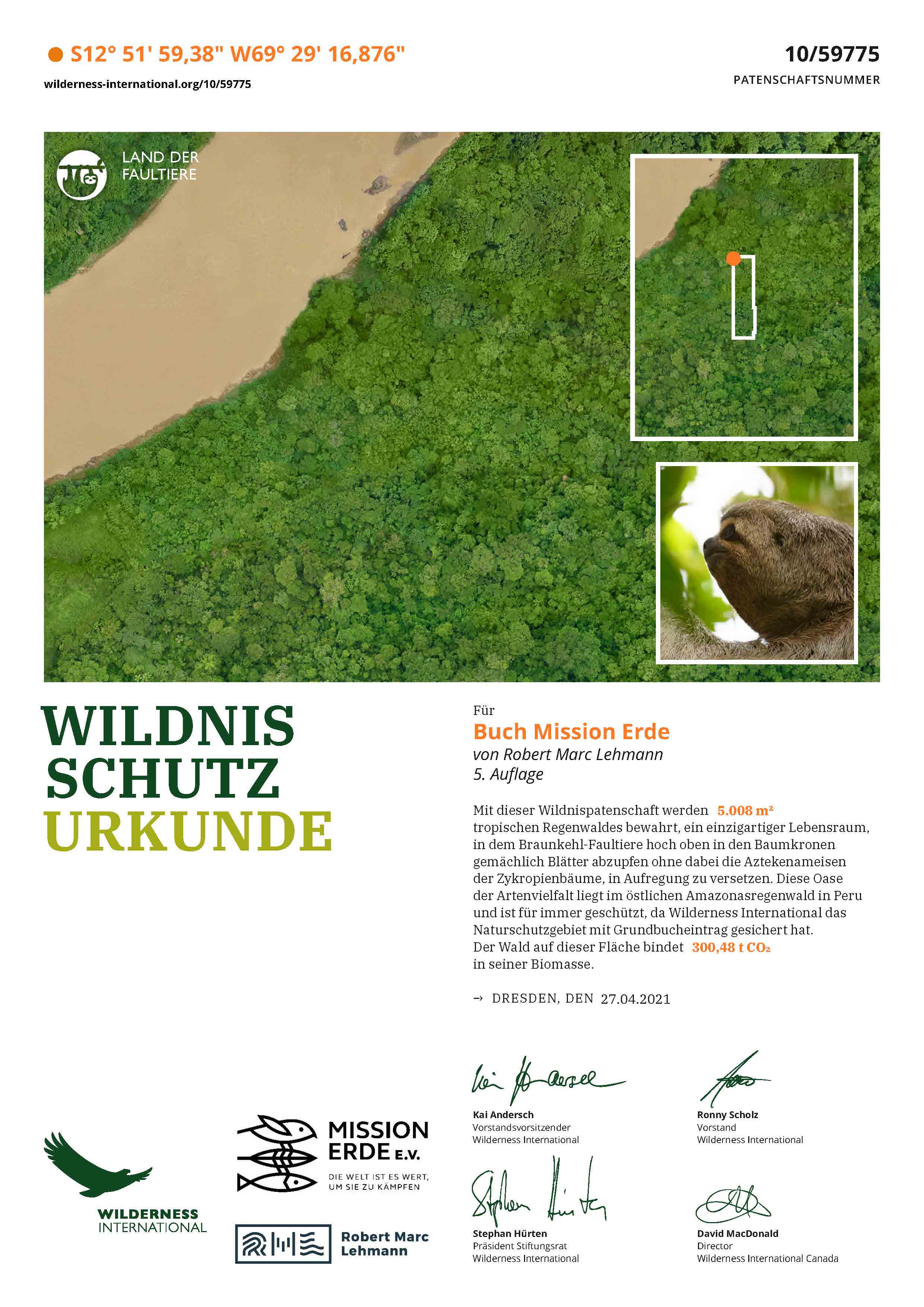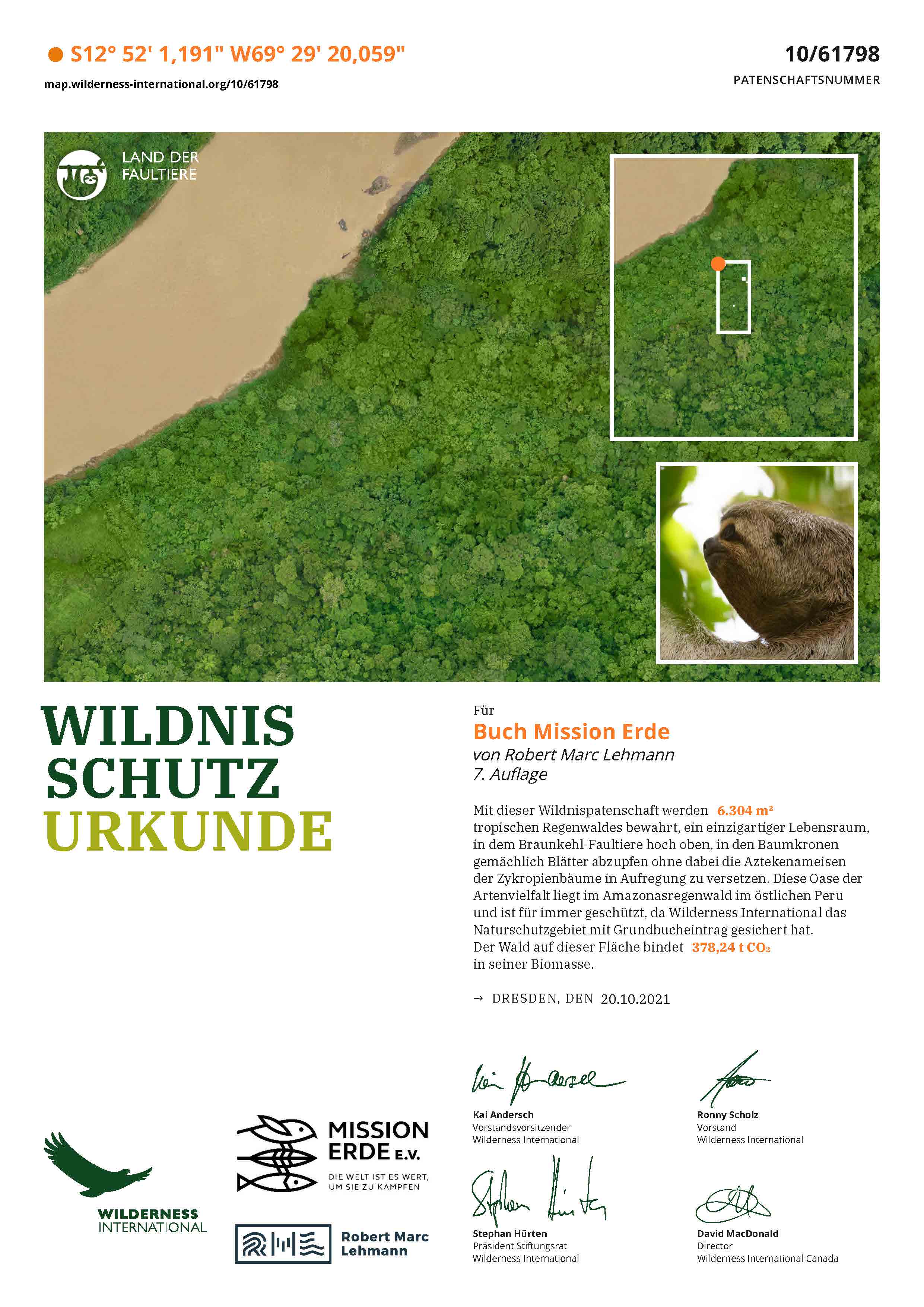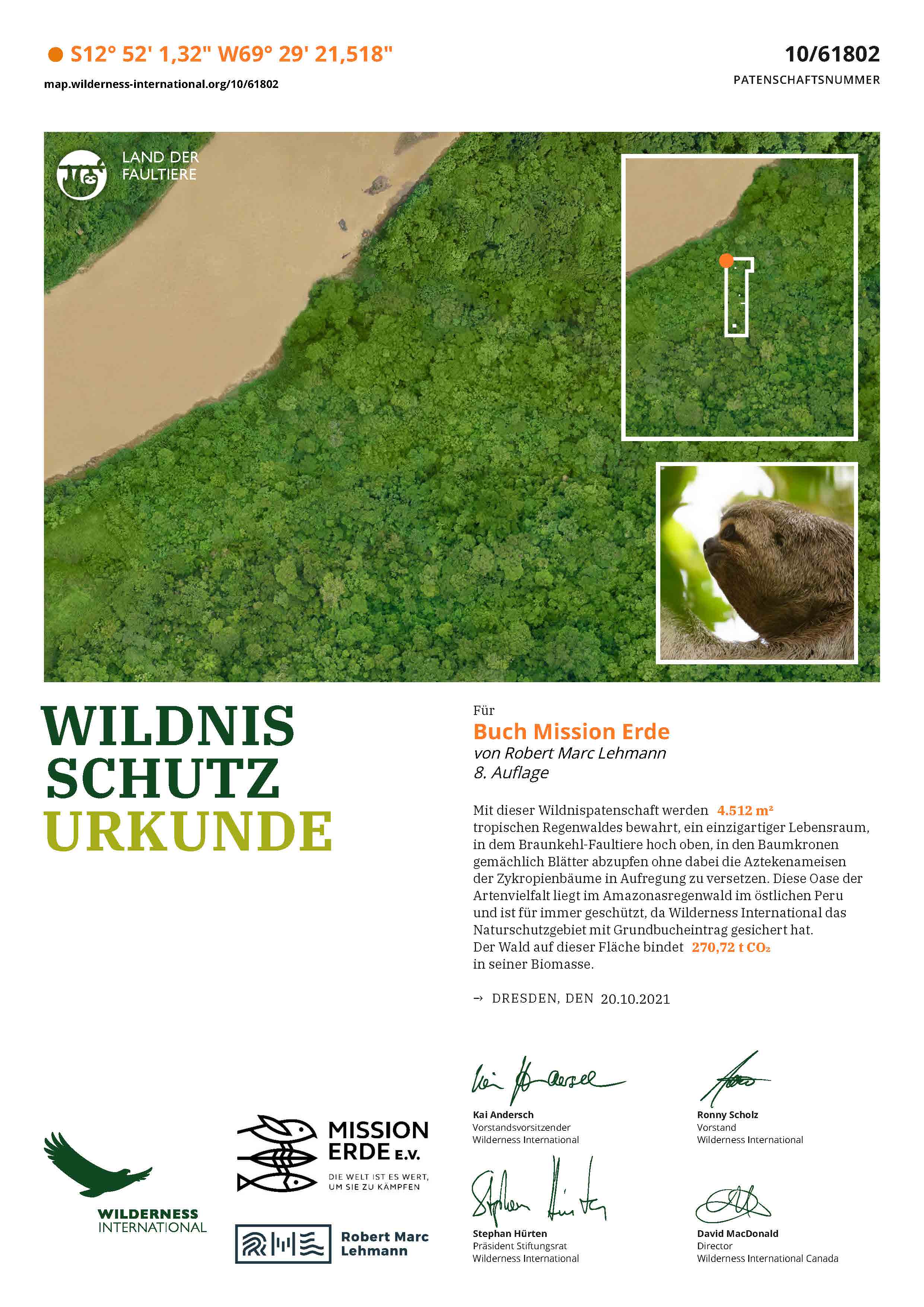 Mit dem Kauf von Robert Marc Lehmanns Buch hast du einen Quadratmeter Urwald für immer geschützt und damit die Mission tatkräftig unterstützt!