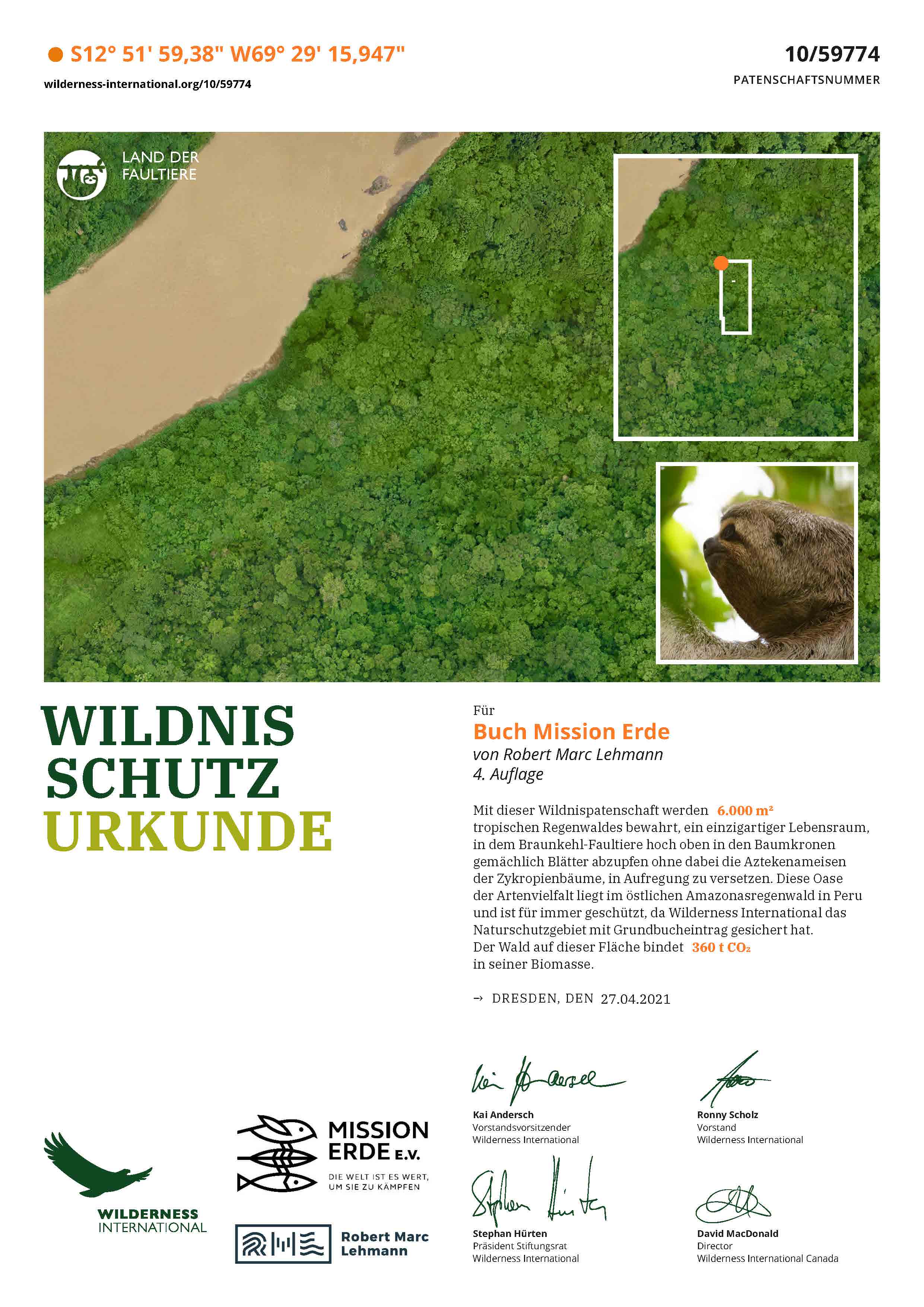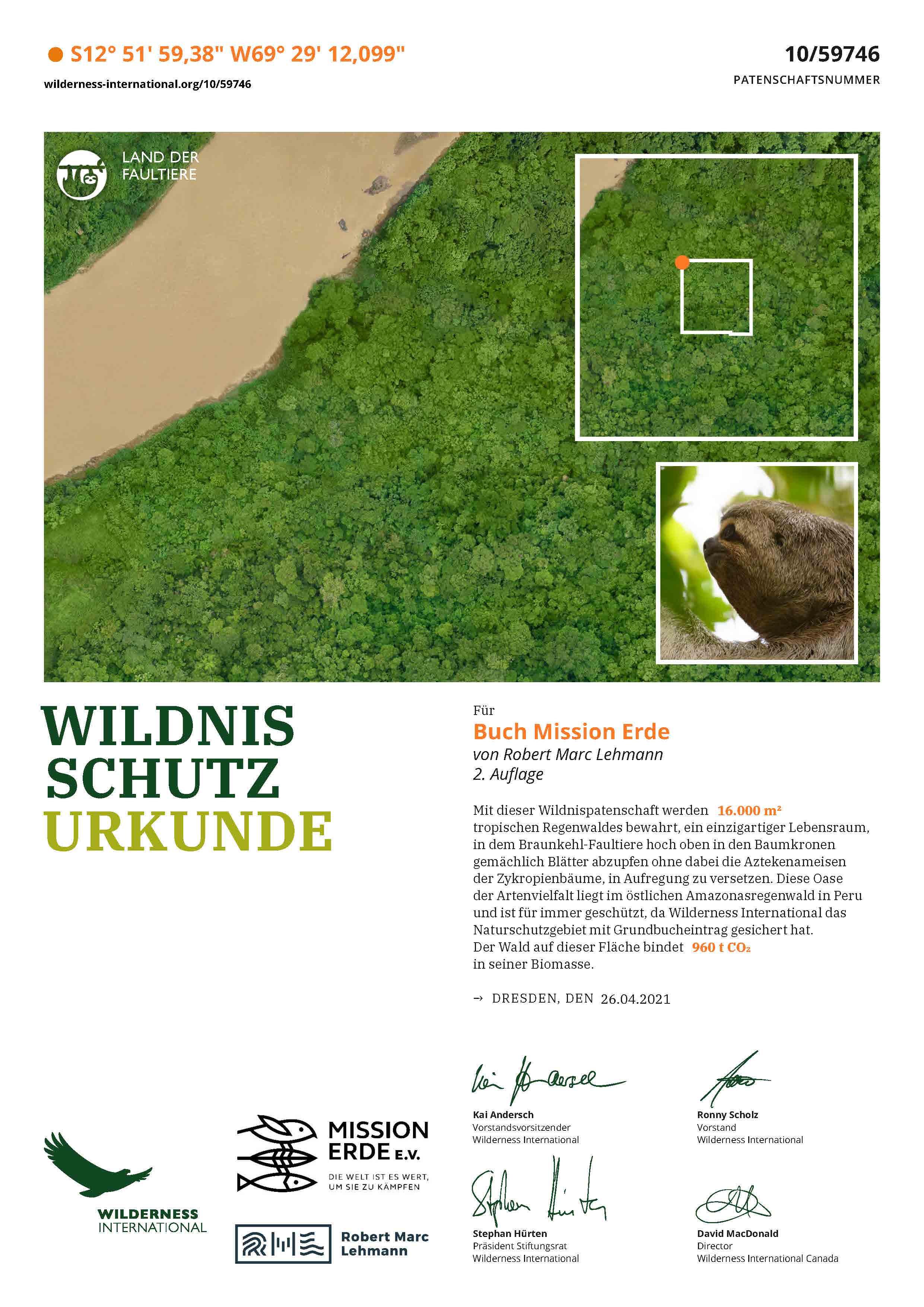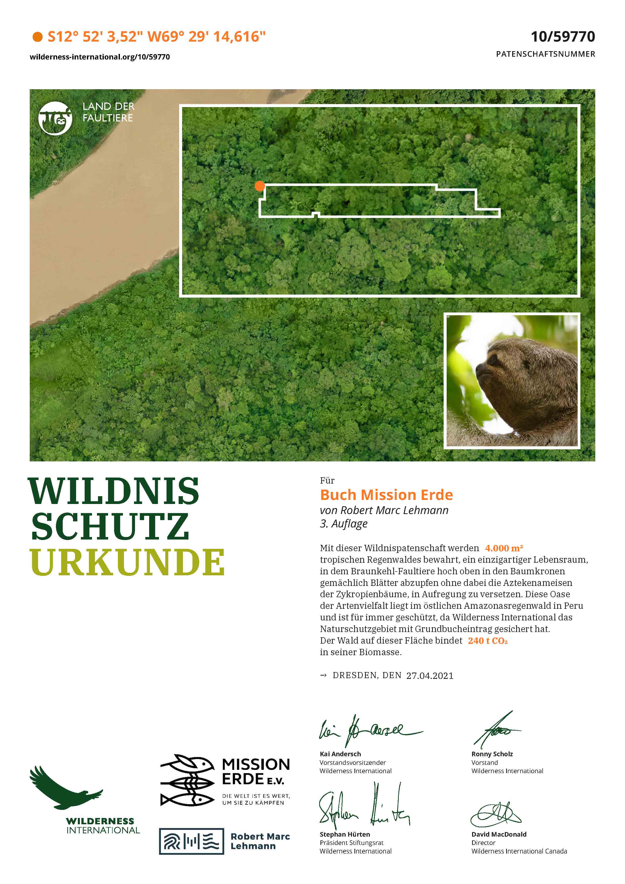Mit dem Kauf von Robert Marc Lehmanns Buch hast du einen Quadratmeter Urwald für immer geschützt und damit die Mission tatkräftig unterstützt!