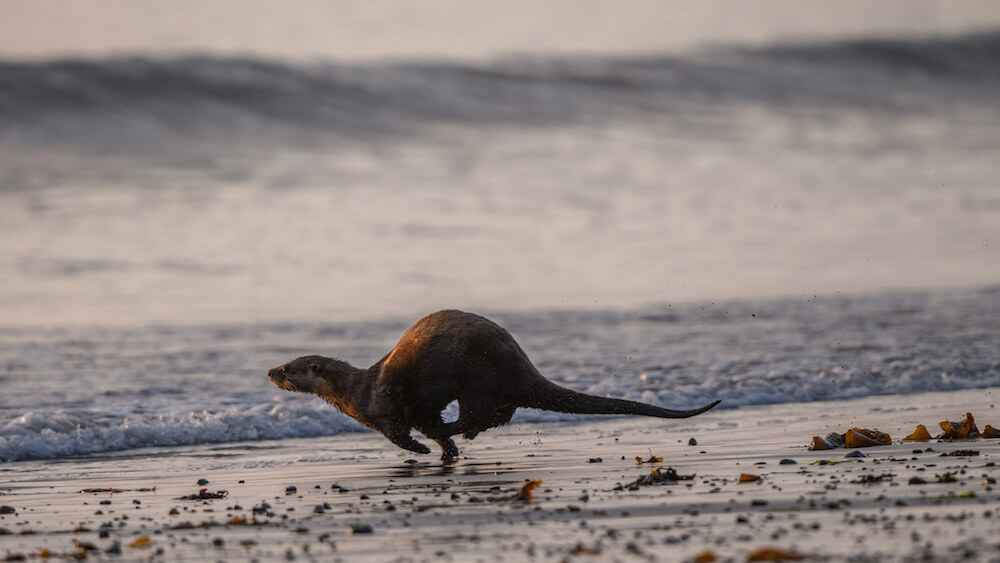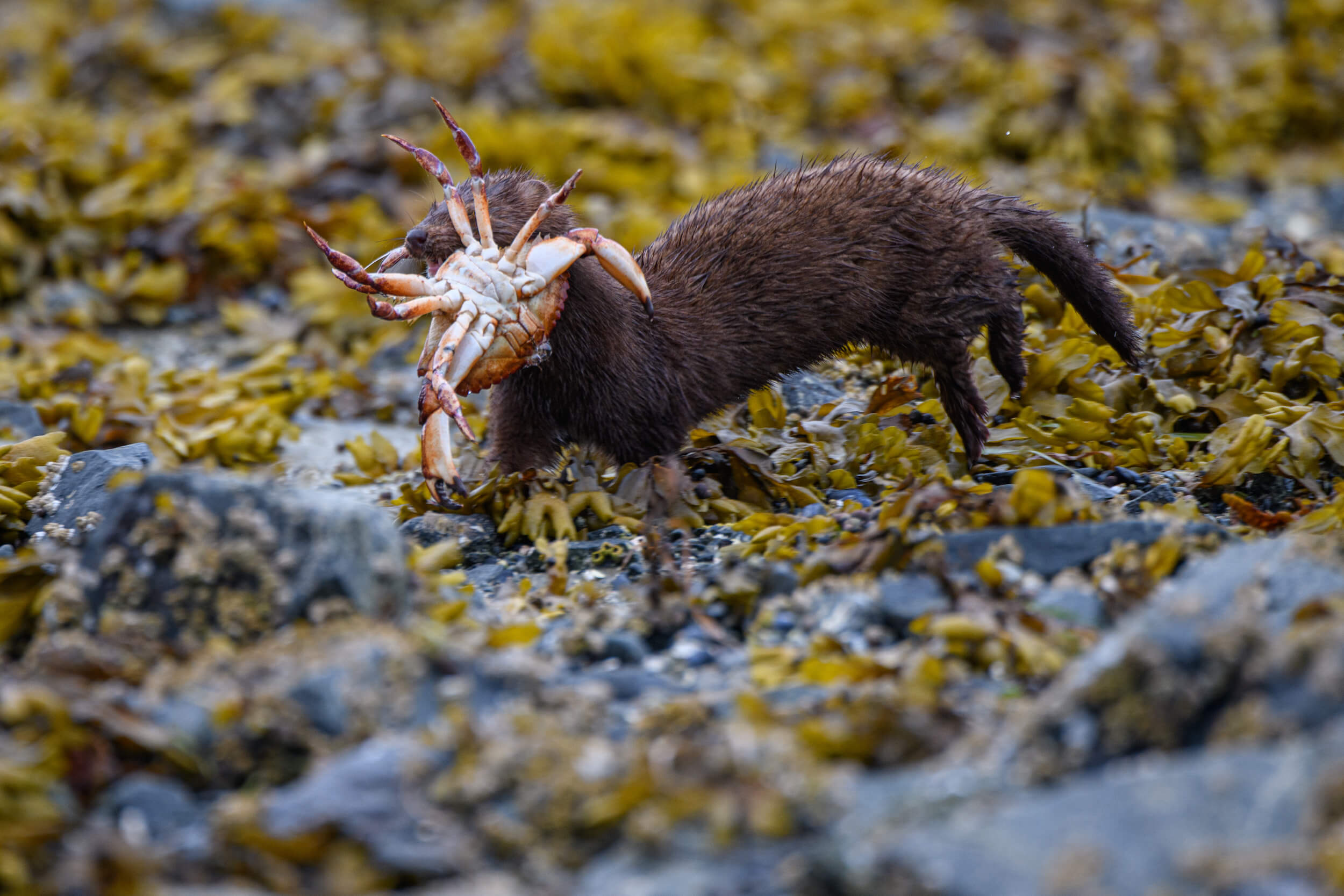 Das Rascheln der Krebse, die rasch zwischen den Steinen verschwinden gleicht dem Geräusch einer Welle. Zwischen Algen und Kelp stellt ein verspielter Nerz seiner Leibspeise nach, den Seeohren. Im Meer jagen Fischotter nach Muscheln und Schnecken. Dann flitzen sie schnell über den Strand in den schützenden Wald, denn an der Küste sind sie leichte Beute für die Wölfe. Im Schutz des Dickichts können sie ihre Meeresfrüchte in Ruhe genießen und düngen den Waldboden mit den Mineralien der Muscheln.