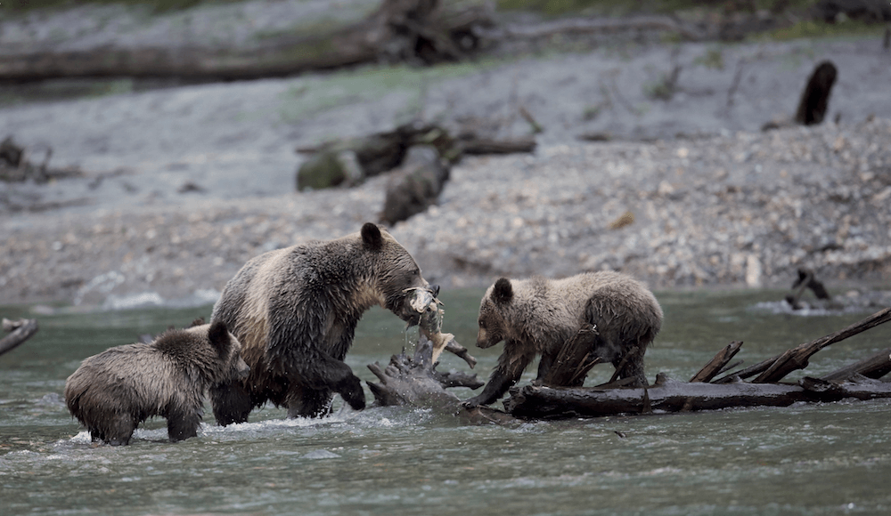 In der Wildnis des Toba-Tals gibt es sie noch: eine gesunde Grizzlypopulation. Da es reichlich zu fressen gibt, kann eine Mutter in einem Jahr 3-4 Junge auf die Welt bringen. Auf den Tisch kommt die vielfältige Vegetation der Flussläufe, und im Spätsommer und Herbst können sich die Bären an tausenden von Lachsen den überlebenswichtigen Winterspeck anfressen. Für ihre sechsmonatige Winterruhe sind die Wurzelhöhlen uralter Baumriesen essentiell, die nur durch ungestört ablaufende natürliche Prozesse entstehen.