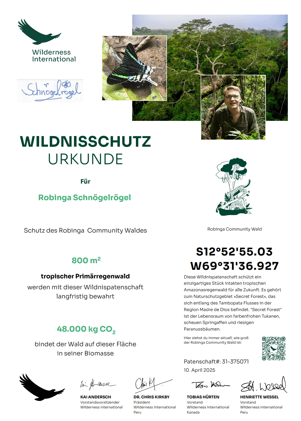 Du erhältst direkt nach deiner Spende eine personalisierte Urkunde über das von dir geschützte Stück Wildnis. Sie eignet sich übrigens auch super als Geschenk!