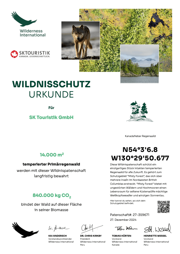 Nicht nur das geteilte Kanadafieber hat SK Touristik an Wilderness International überzeugt – auch die transparente und konkrete Verwendung der Spenden: 1€ Spende schützt 1 m² Urwald – und zwar für immer. Spender:innen erhalten eine Urkunde mit den Geokoordinaten und einem Luftbild des geschützten Waldstücks, sowie eine steuerlich absetzbare Spendenbescheinigung.