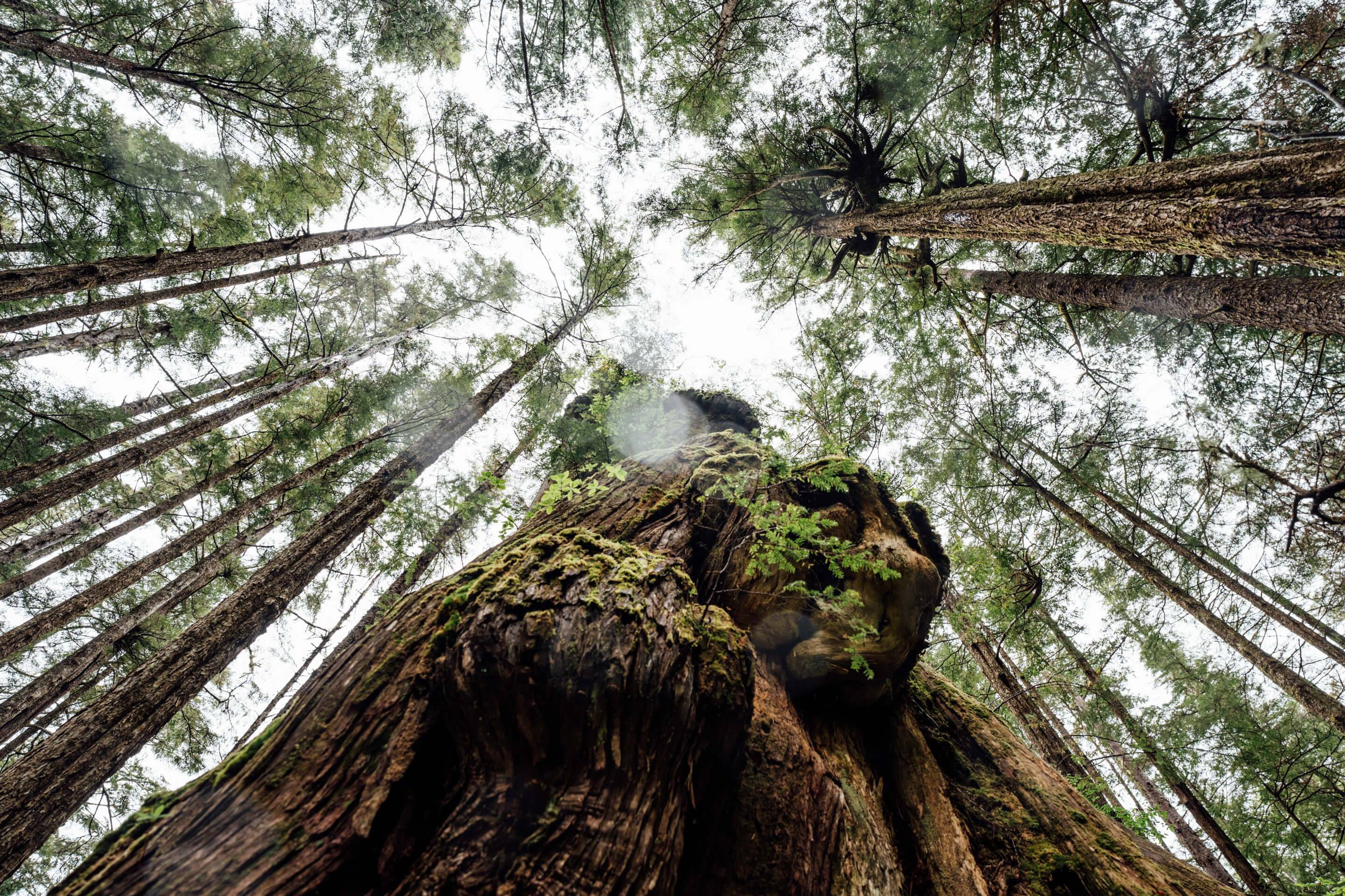 Ein Blick in die beeindruckenden Baumkronen im temperierten Regenwald. Manche Baumriesen hier werden über 100 Meter hoch!